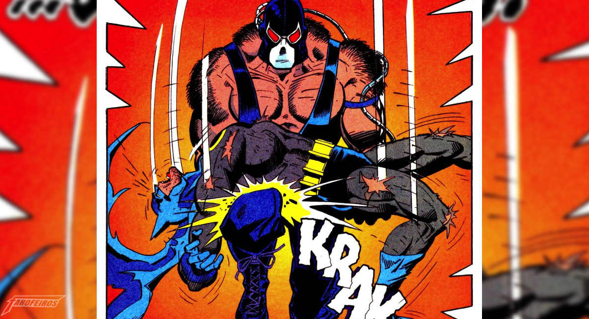 Abaixo temos a cena dos quadrinhos da DC Comics, com Bane quebrando a coluna de Batman.