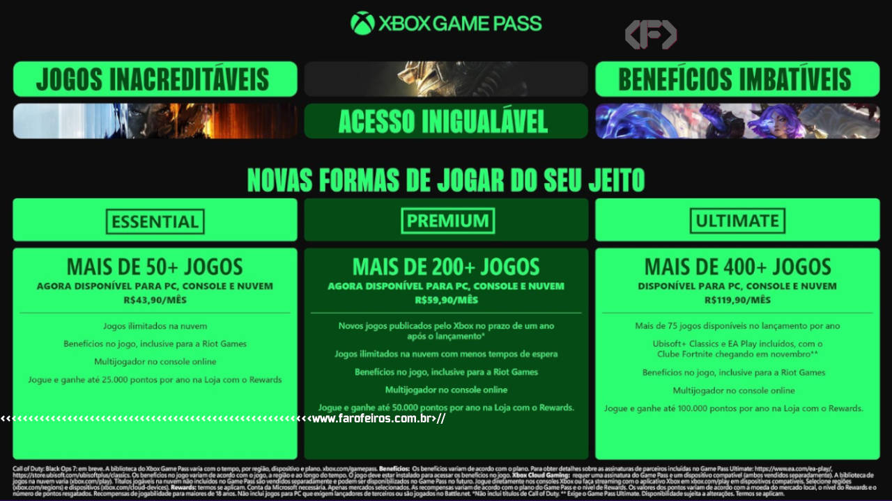 Ainda criaram o plano Premium por R$ 59,90 – com o preço antigo do Ultimate. Só que esse não tem jogos no dia do lançamento. E o Essential por R$ 43,90, com apenas 50 jogos disponíveis.