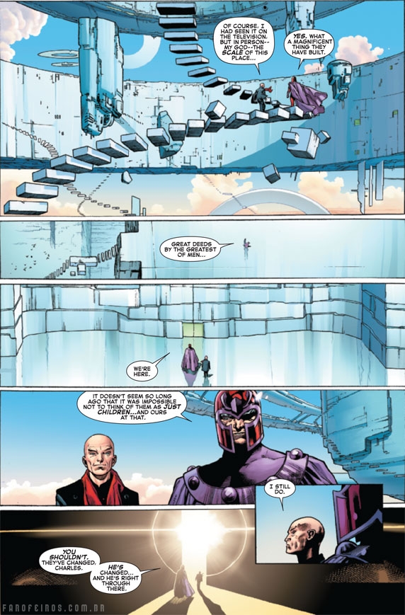 Mais um preview direto da gringa do confronto entre Vingadores e X-Men. O preview de Avengers Vs X-Men #8 mostra inicialmente uma visita de Charles Xavier à Utopia guiada por Magneto. É claro que Ciclope dominado pela força Fênix (ou virado no treze) iria mandar umas pataguadas para seu antigo professor.