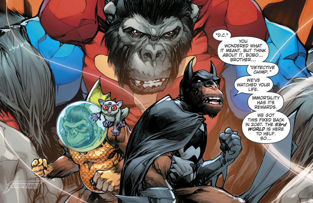 Mas sinais começam a chegar do universo 53… mas não existe universo 53 na DC, existe? E o “D” e “C” do início significava Detetive Chimp apenas, e não DC (comics). Bem, pelo visto existe e a ajuda vem de lá. Apenas pelo quadro abaixo já podemos ver que se trata de um gibi escrito por Grant Morrison, não é verdade?